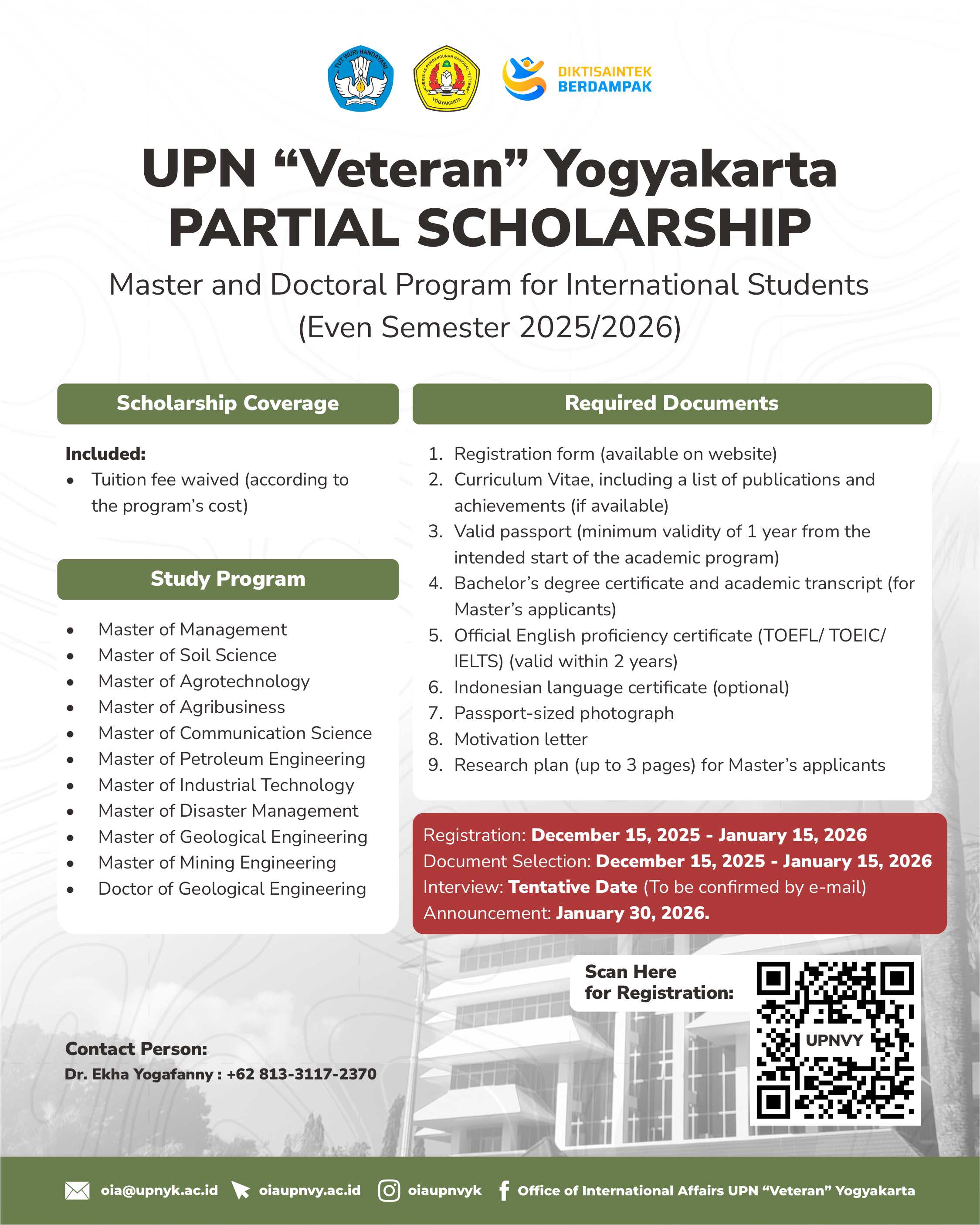 UPN “Veteran” Yogyakarta (UPNVY), an Indonesian public university located in the heart of Yogyakarta—Indonesia’s renowned City of Students—is pleased to announce the opening of Partial Scholarship opportunities for international students for Master’s and Doctoral Programs in the Even Semester of Academic Year 2025/2026.